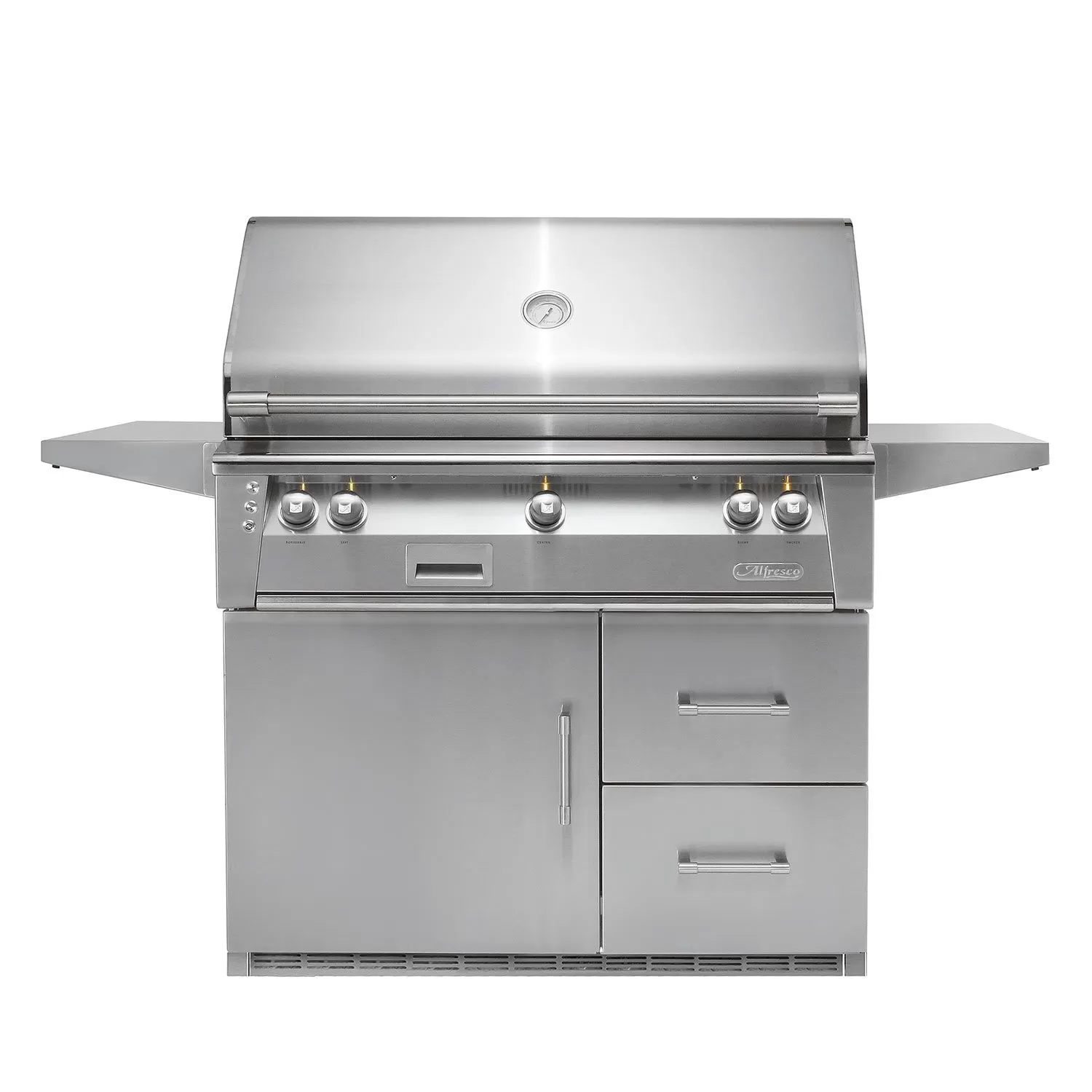 Alfresco ALXE-42RFG Refigerated Cart Grill, 42-Inch provides a high performance luxury grill that is a terrific option to complete your outdoor kitchen. The 304 stainless steel grill features (3) 18-SR stainless steel main burners producing 82,500 BTUs with 770 square inches of grilling area with the option to upgrade to a Sear Zone infrared burner or a dual side burner. The Sear Zone features a “V-shaped” design and reaches temperatures up to 1500°F to produce professional steakhouse results using up to 50% less fuel. Above the burners, the pyramid-shaped ceramic briquettes eliminate hot and cold spots to maximize flavor as they evenly deliver heat to the cooking surface. The premium cooking grates have a special nonstick electro-polished finish, to achieve professional grill marks every time. The industry first refrigerated cart includes 1 door and 2 drawers that are refrigerated to allow you to keep condiments, meats, vegetables and beverages within reach while grilling.