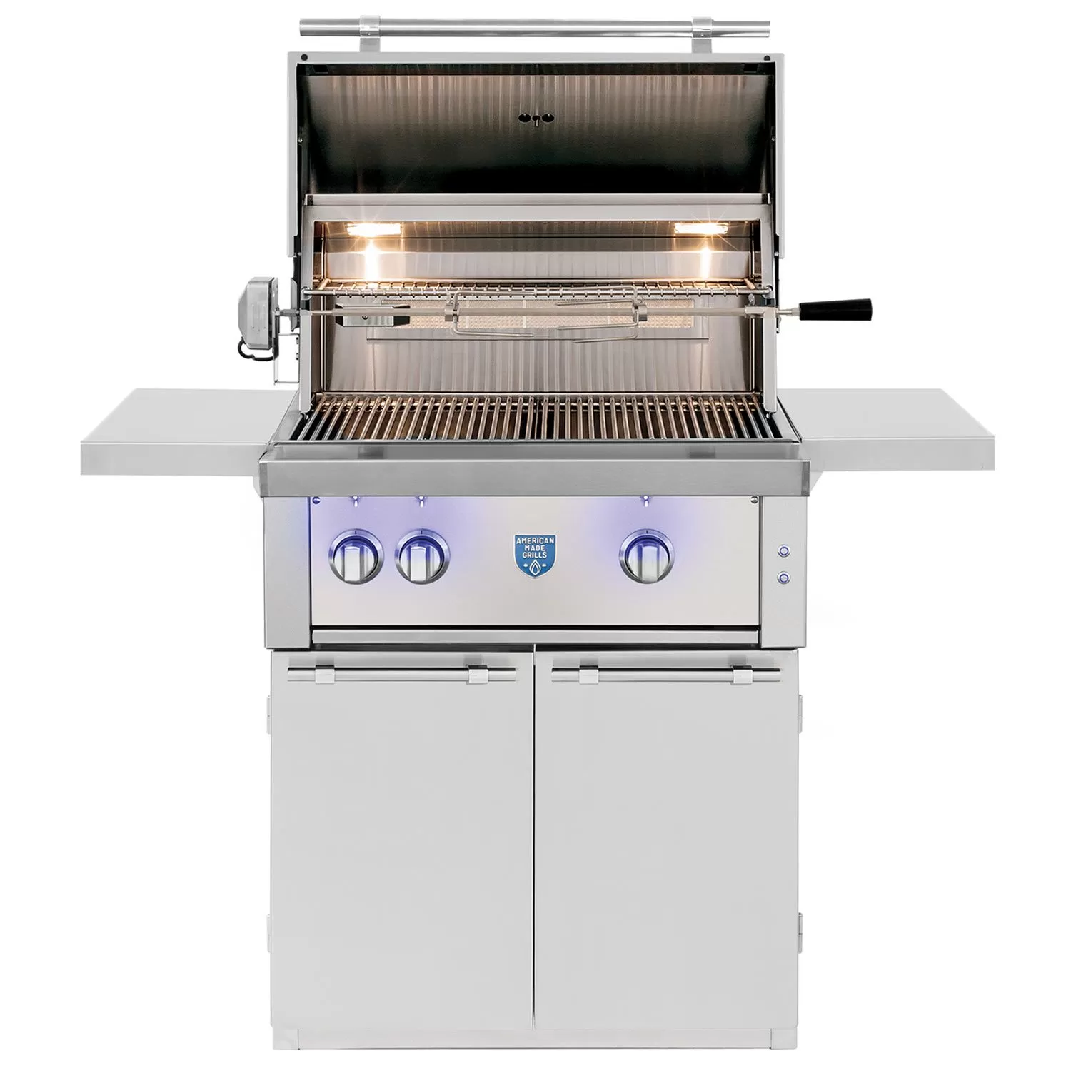 American Made Grills AMG-EST30-CART Estate 30-Inch Gas Grill with Infrared Searing Burner and Rotisserie Kit on Cart features American-made quality and performance construction to offer a superior grilling experience. Built from solid 304 stainless steel, it is sure to provide excellent quality for years to come, and it features (2) red brass main burners that put out 26,000 BTUs each to provide ultra high heat to the signature captured briquette tray for even radiant heat across the 780in² cooking surface. The 9mm thick stainless steel grates offer a thick gauge grilling surface for professional style grill marks. The cart that it comes mounted on features collapsible shelves for additional workspace and locking caster wheels for ease of movement and safety.