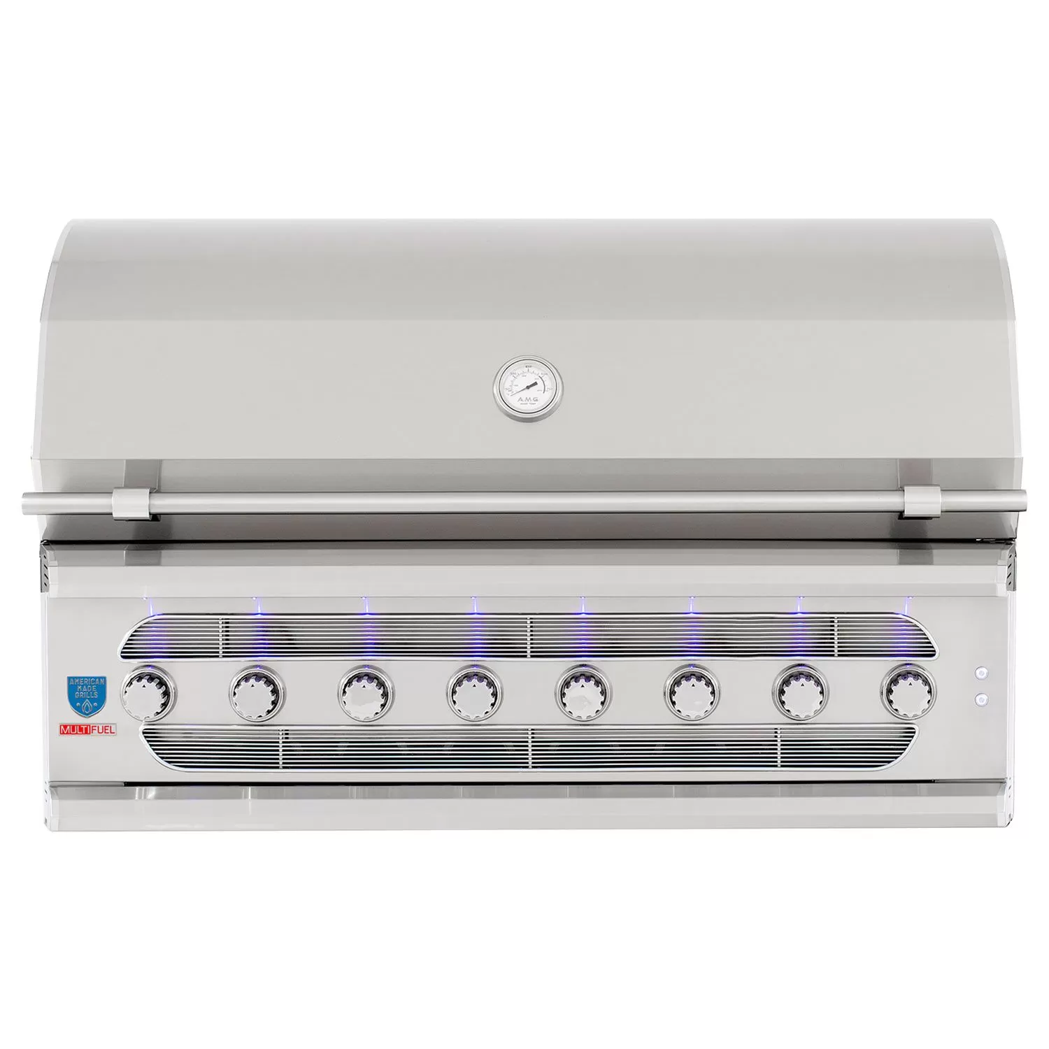 American Made Grills AMG-MUS54 Muscle 54-Inch Built-In Dual Fuel Wood and Gas Grill with Infrared Searing Burner and Rotisserie Kit features American-made quality and performance construction to offer a superior grilling experience. Built from solid 304 stainless steel, it is sure to provide excellent quality for years to come, and it features (8) main burners built from that same 304 stainless steel each putting out 22,000 BTUs each to provide ultra high heat to the signature captured briquette tray for even radiant heat across the 560in² cooking surface. The reversible 9-gauge V-shaped grates offer a substantial grilling surface for professional style grill marks. It also features a patented fuel tray system that allows you to use the gas burners to ignite wood or charcoal, adding excellent flexibility and flavor to your grill game.