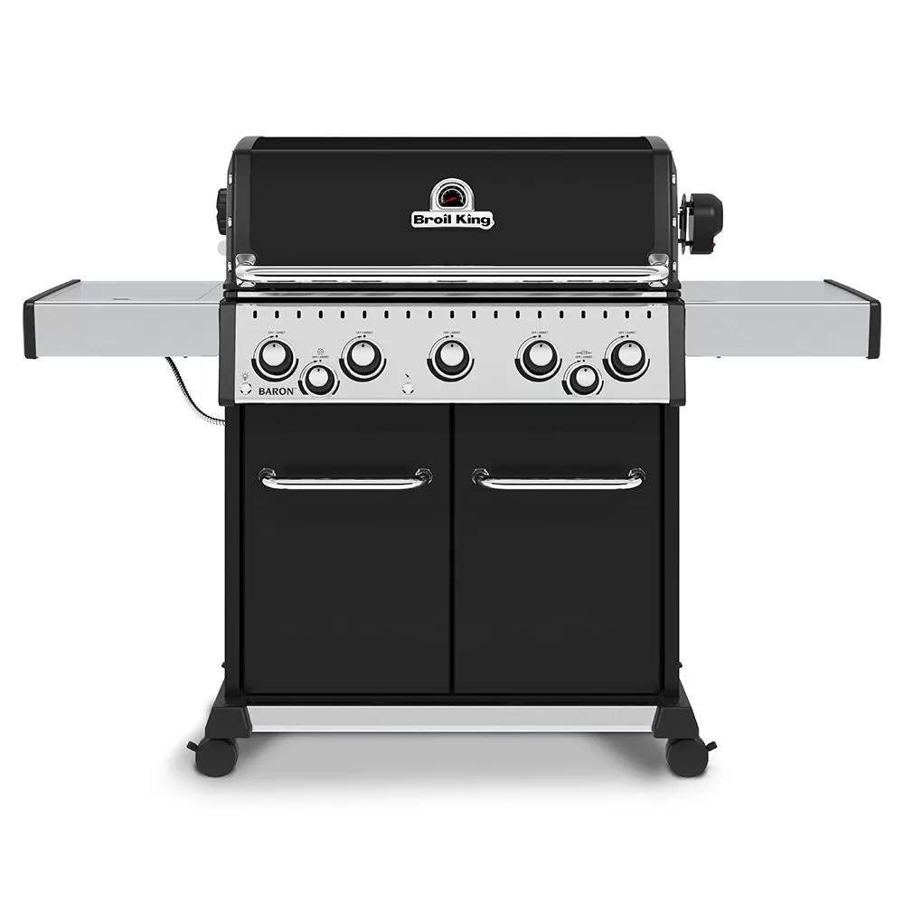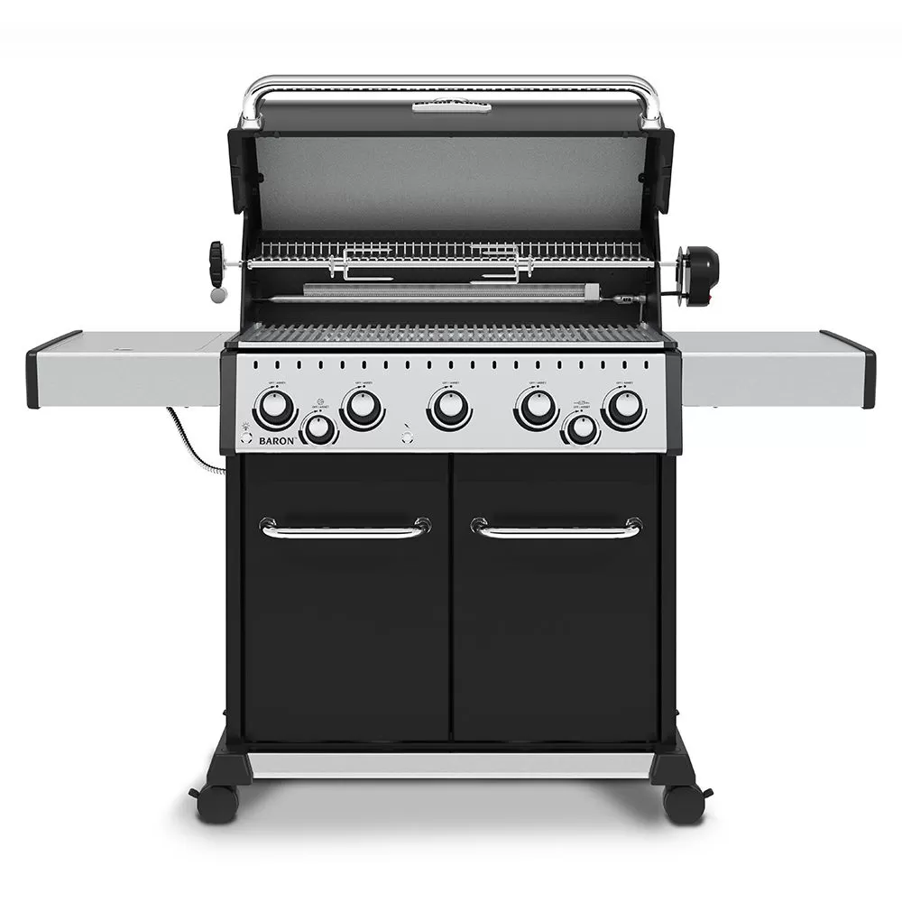 Broil King BR-590 Baron 590 Pro Stainless Steel 5-Burner Gas Grill with Rotisserie and Side Burner, 63-Inches offers a premium grilling experience for your outdoor kitchen. This grill features die-cast aluminum and high-grade stainless steel construction for proven durability and excellent heat retention. Heavy-duty stainless steel cooking grids offer an impressive grilling service for food, while their solid design ensures excellent heat retention and searing power. The stainless steel Flav-R-Wave cooking system offers impressive heat distribution across the entire surface of the grill, while drippings that fall onto the Flav-R-Wave system are instantly vaporized. Five Dual-Tube burners feature high quality, heavy-duty stainless steel construction with a tube-in-tube, side-ported design for even heating. Linear-Flow valves with 180-degree Sensi-Touch control knobs offer smooth and simple heat control to precisely control the temperature of your grill.