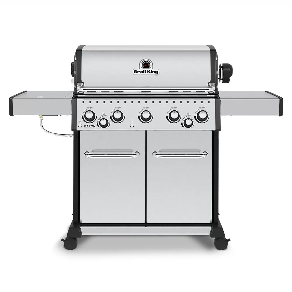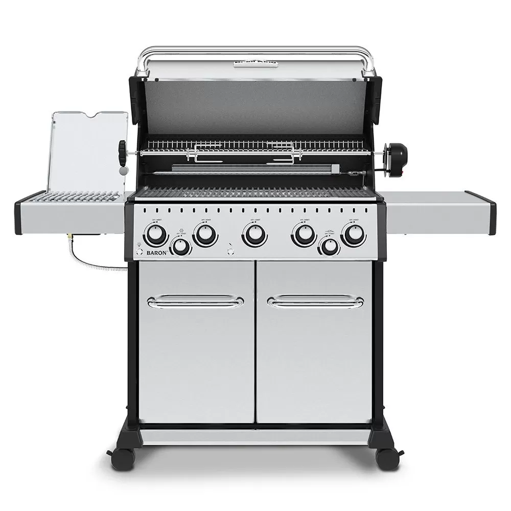 Broil King BR-S590 Baron S590 Pro Stainless Steel Infrared 5-Burner Gas Grill with Rotisserie and Side Burner, 63-Inches offers a premium grilling experience for your outdoor kitchen. This grill features die-cast aluminum and high-grade stainless steel construction for proven durability and excellent heat retention. Heavy-duty stainless steel cooking grids offer an impressive grilling service for food, while their solid design ensures excellent heat retention and searing power. The stainless steel Flav-R-Wave cooking system offers impressive heat distribution across the entire surface of the grill, while drippings that fall onto the Flav-R-Wave system are instantly vaporized. Five Dual-Tube burners feature high quality, heavy-duty stainless steel construction with a tube-in-tube, side-ported design for even heating. Linear-Flow valves with 180-degree Sensi-Touch control knobs offer smooth and simple heat control to precisely control the temperature of your grill.