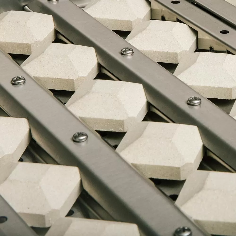 - Ceramic briquettes absorb heat and distribute it evenly throughout the grill to avoid hot and cold zones.