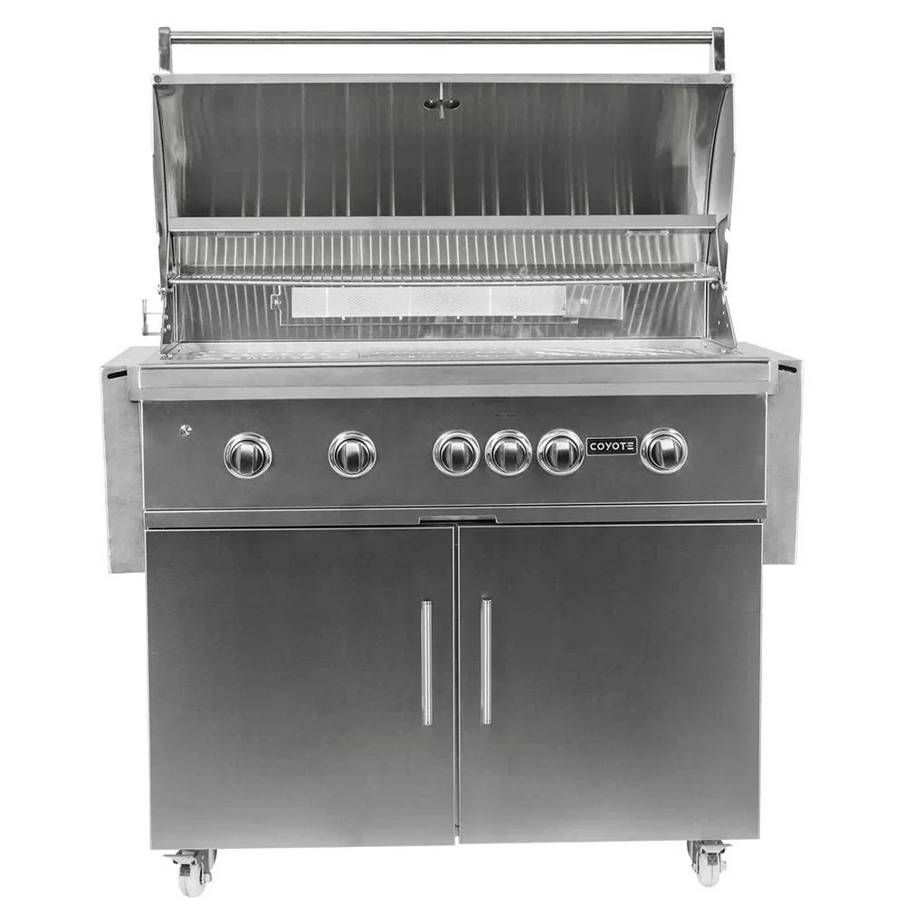 Coyote S-Series Stainless Steel Freestanding Gas Grill with Infrared Sear Burner & Rotisserie, 42-Inch (C2SL42-CT) provides a premium grilling option for your outdoor kitchen. The Coyote S-Series grill features complete 304 stainless steel construction and has been manufactured for high performance with four Coyote Infinity Burners, one Coyote RapidSear Burner and one infrared rear burner. Ceramic briquette heat control grids offer supreme radiant heating for better results across all 955 square inches of cooking space, while the included rotisserie kit and smoker box allow for expanded cooking options. Additional features include interior grill lighting for easier visibility in low-light conditions as well as LED illuminated control knobs. This base grill can also be upgraded with a variety of products and accessories custom built for this grill model (sold separately).