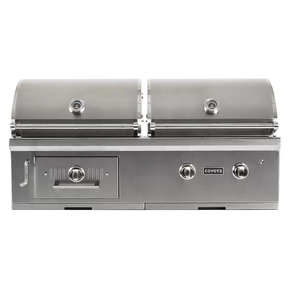 Coyote Stainless Steel Built-In Gas & Charcoal Combo Grill, 50-Inch (C1HY50) provides a premium hybrid grill for your outdoor kitchen space. On the gas half of this grill, two high-performance Coyote I-Burners offer heating capabilities up to 40,000 BTU of heat output across 600 square inches of cooking space. In addition, integrated interior lighting makes low-light grilling easier. On the charcoal side of the grill, an adjustable fuel tray and adjustable dampers allow for precise heating and airflow control as well as an additional 600 square inches of cooking space. This base grill can also be upgraded with a variety of products and accessories custom built for this grill model (sold separately).