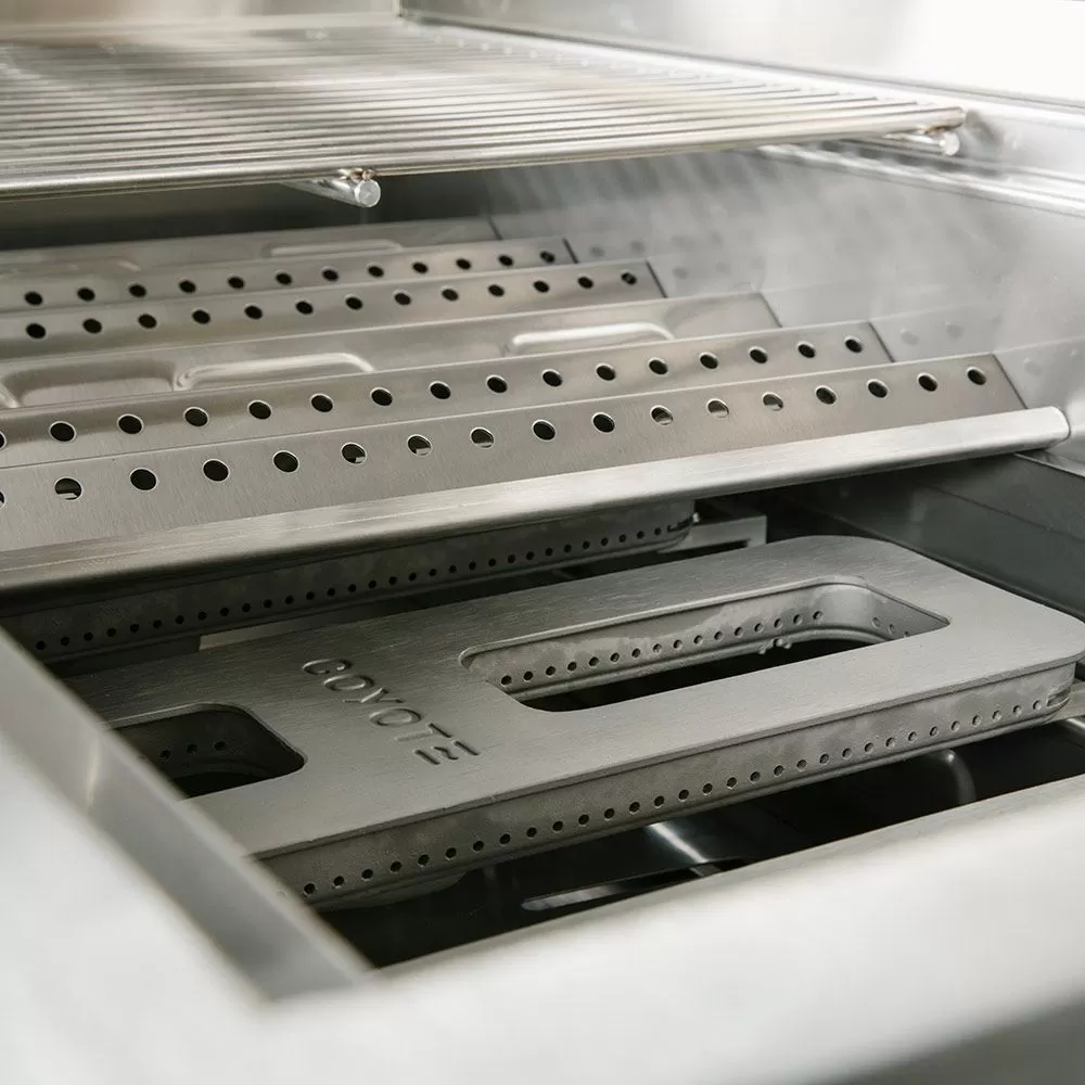 - Two Coyote I-Burners offer up to 40,000 BTU heat output on the gas side of the grill.