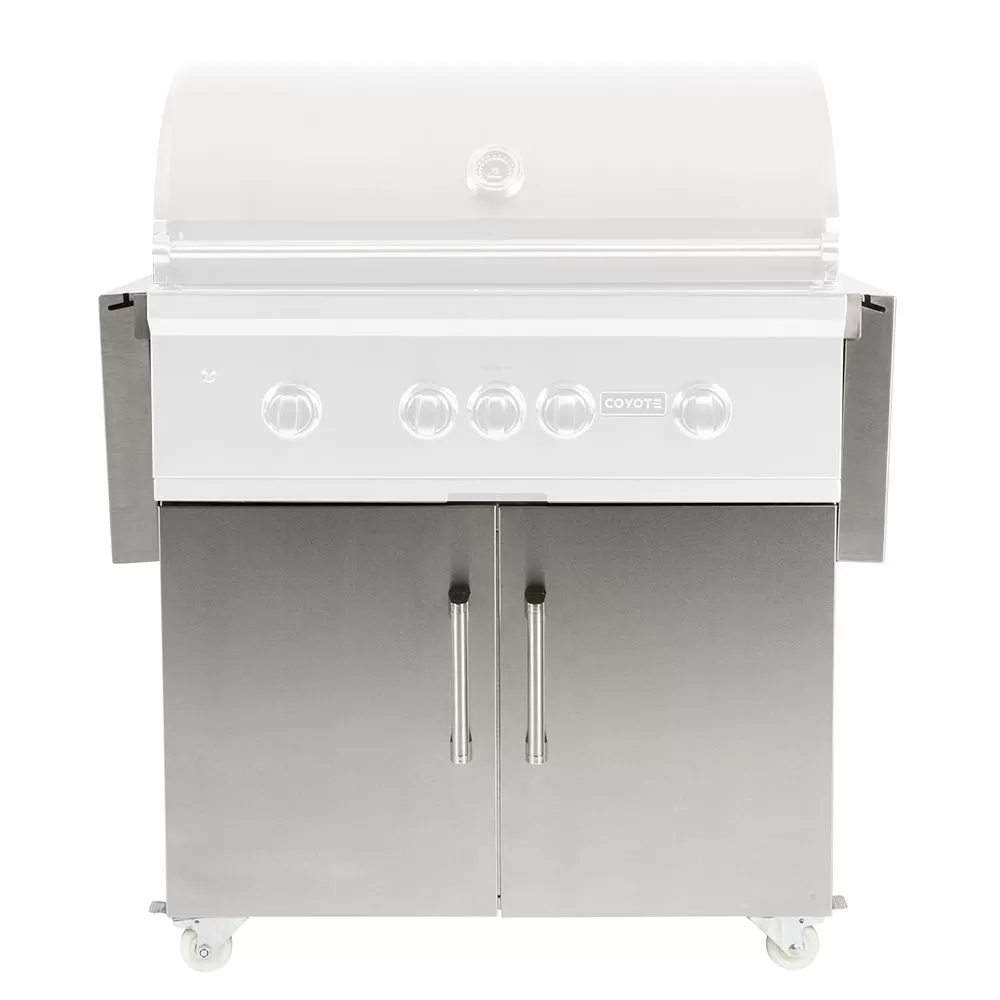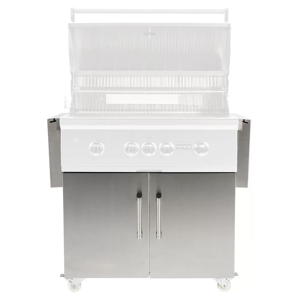 Coyote Stainless Steel Grill Cart, 36-Inch (C1S36CT) provides a premium grill cart to match a Coyote gas grill head. This cart features self-closing doors and drawer hinges for a high-end feel. Fold down side shelves offer space when you need it and extra room when you don’t, while industrial-quality locking casters offer easy movement. An interior slide-out shelf offers the perfect space for propane tank storage (if applicable), and the entire cart comes fully assembled for easy installation.