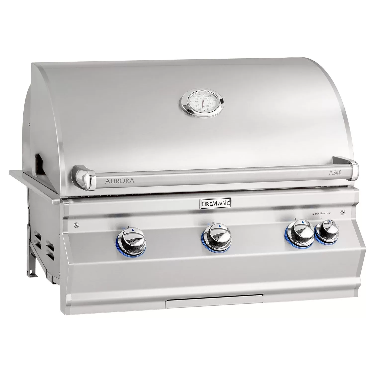 Fire Magic A540i Aurora Built-In Gas Grill provides a high end grill that’s crafted for cooking versatility, durability and longevity – truly a grill of superior design and engineering. The complete 304 stainless steel construction is highlighted by the cast stainless steel “E” burners capable of up to 30,000 BTU each. Fire Magic’s Diamond Sear Cooking Grids provide optimal heat transfer while the 16 gauge stainless steel flavor grids are specially designed to provide even heat distribution preventing hot and cold zones and protect the burners from grease and drippings. The modest 540in² grilling surface offers plenty of grilling area while the optional 18,000 BTU back burner comes with a heavy duty rotisserie kit for professional style cooking.