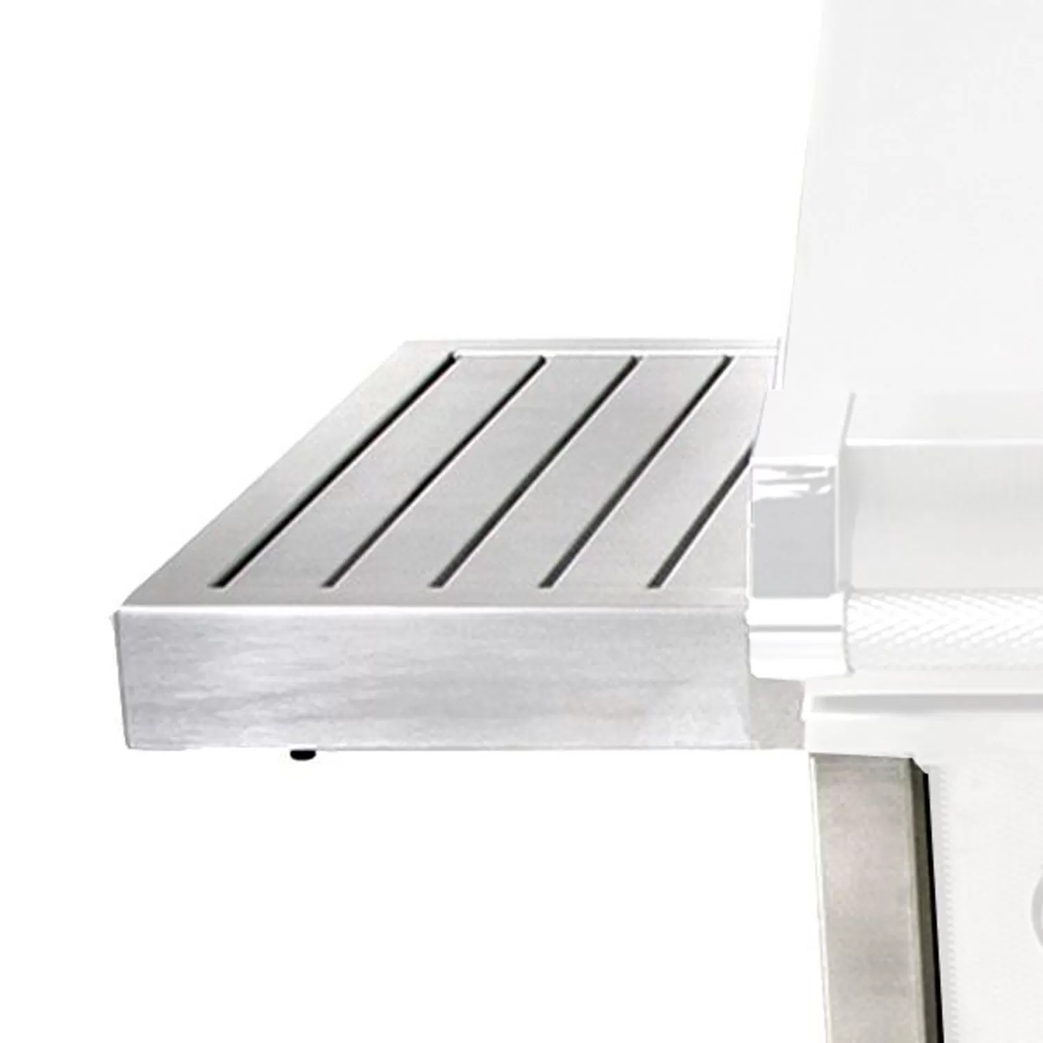 - Includes – Fold down shelves for increased space, slide out LP tank tray or trash storage, Marquise accented stainless steel panels