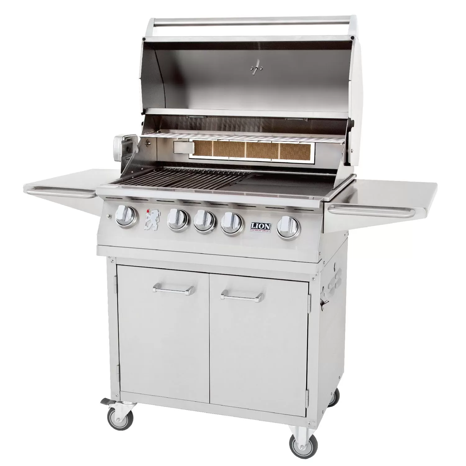 This freestanding grill includes a premium BBQ grill cart for enhanced mobility and versatility. This cart features heavy-duty 16-gauge 304 stainless steel construction to match the grill head for dependable durability. The L75000 cart offers ample storage space inside the grill–perfect for tools or propane tank storage. A two-door design offers easy accessibility, while commercial quality casters offer easy movement. As an added bonus, this grill includes a package of useful accessories to elevate your grilling experience. A smart canvas head cover protects the grill from the elements, and a rotisserie kit lets you get the most out of the grill’s infrared rear burner. It also comes with a smoker box, letting you achieve superb flavor and a griddle and griddle remover, letting you switch things up to broaden your horizons.