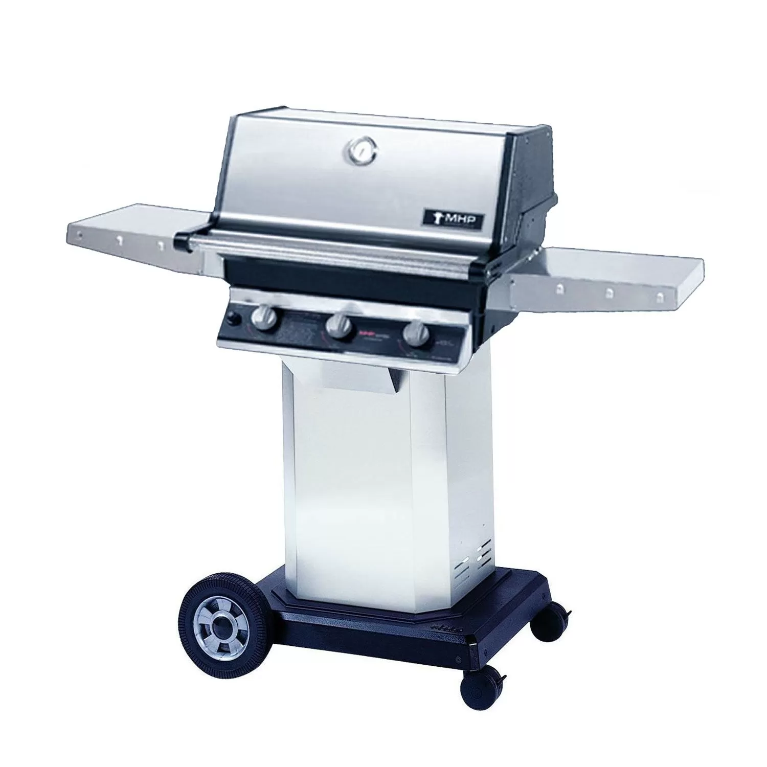 Modern Home Products T3G4DD Tri-Burn Gas Grill with SearMagic Grids On Cart, 27-Inch offers a premium built-in gas grill option that combines hand-crafted, high quality materials with superior function and timeless tradition. The grill features stainless steel construction to provide an elegant, durable hood that promotes heat retention while the rolling Sta-Kool stainless steel hood handle makes opening your grill a breeze. This unit includes aluminum rust-free SearMagic grids and a stainless steel swing-away warming rack. The reversible SearMagic technology is characterized by one wide-ribbed side for achieving professional sear lines and one smooth side for foods such as fish or vegetables. The unique Tri-Burn system consists of 3 cast stainless steel burners and flavor plates that work together to create 35,000 BTU of power. The individual temperature controls this option provides gives the griller maximum flexibility when cooking. The on-cart grilling option offers the 27-inch gas grill head on a freestanding aluminum cart with two wheels. You also have the option to pair your grill with a 4-wheeled (2 casters) black aluminum or stainless steel column. All of this, in addition to two added stainless steel side shelves, the 433 square inches of main cooking area and built-in temperature gauge, makes it is easy to see why the T3G4 from MHP is an ideal grilling option for anyone needing complete burner independence. Upgrade your grill with a SearMagic Infrared Zone Side Burner, Stainless Steel Side Burner or Infra-Roast Rear Rotisserie Burner.