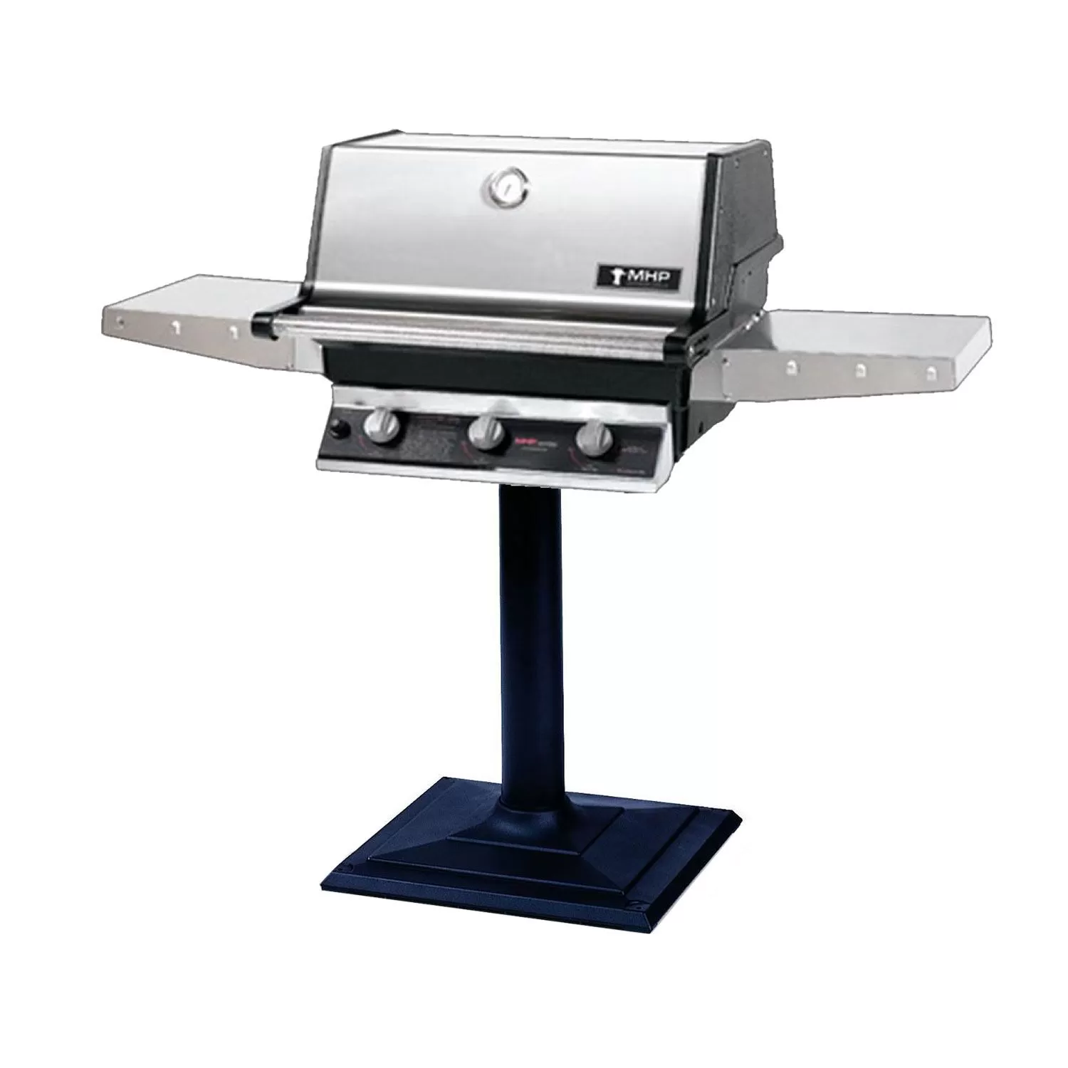 Modern Home Products T3G4DD Tri-Burn Gas Grill with SearMagic Grids On Patio Base, 27-Inch offers a premium built-in gas grill option that combines hand-crafted, high quality materials with superior function and timeless tradition. The grill features stainless steel construction to provide an elegant, durable hood that promotes heat retention while the rolling Sta-Kool stainless steel hood handle makes opening your grill a breeze. This unit includes aluminum rust-free SearMagic grids and a stainless steel swing-away warming rack. The reversible SearMagic technology is characterized by one wide-ribbed side for achieving professional sear lines and one smooth side for foods such as fish or vegetables. The unique Tri-Burn system consists of 3 cast stainless steel burners and flavor plates that work together to create 35,000 BTU of power. The individual temperature controls this option provides gives the griller maximum flexibility when cooking. The on-post grilling option offers a 48-inch in-ground post or a bolt-down post for your grilling needs – these posts are aluminum constructed with stainless steel tubing to ensure a durable, reliable setup. You also have the option to pair your grill with a patio base on either a black aluminum or stainless steel column. All of this, in addition to two added stainless steel side shelves, the 433 square inches of main cooking area and built-in temperature gauge, makes it is easy to see why the T3G4 from MHP is an ideal grilling option for anyone needing complete burner independence. Upgrade your grill with a SearMagic Infrared Zone Side Burner, Stainless Steel Side Burner or Infra-Roast Rear Rotisserie Burner.