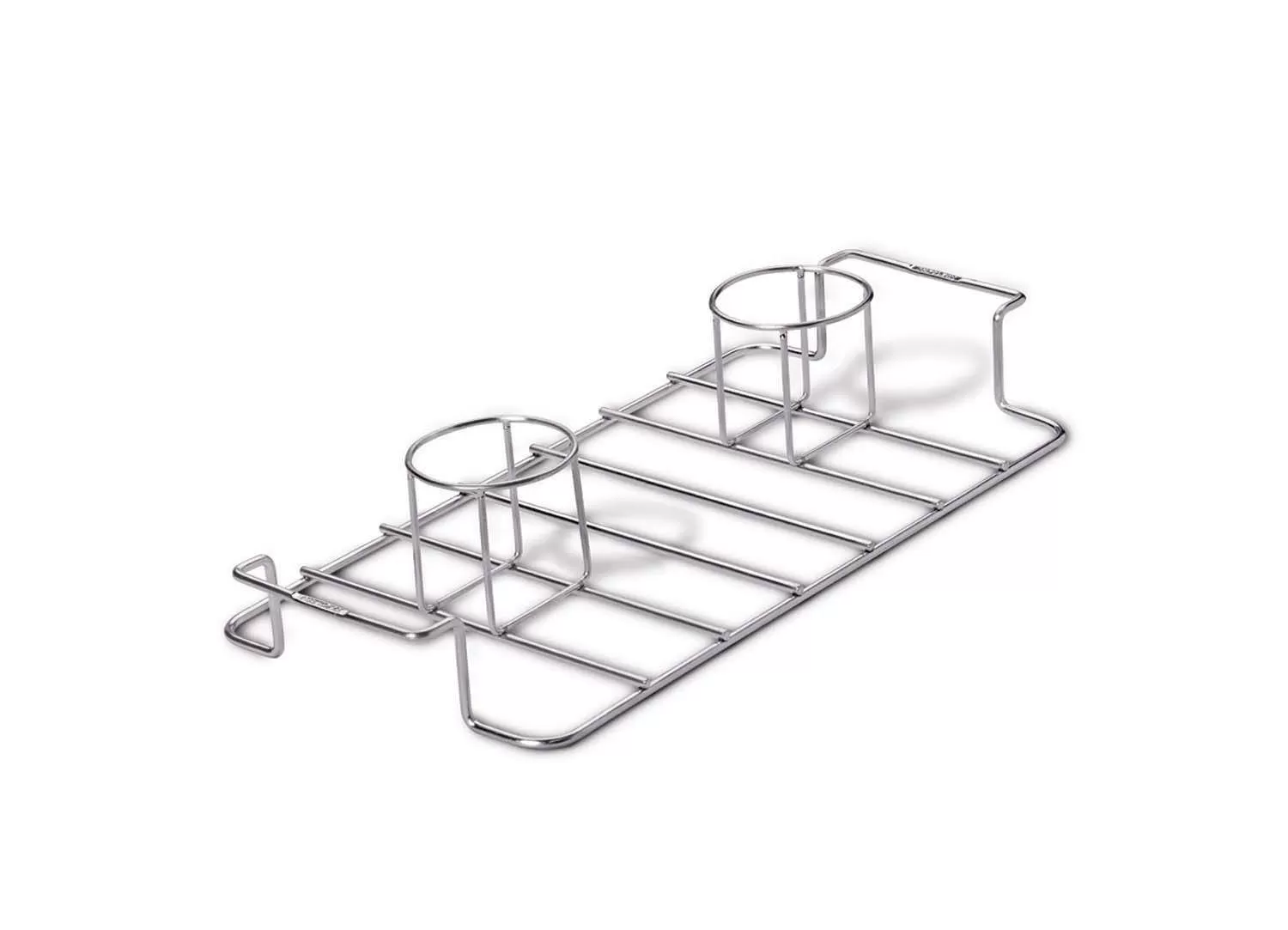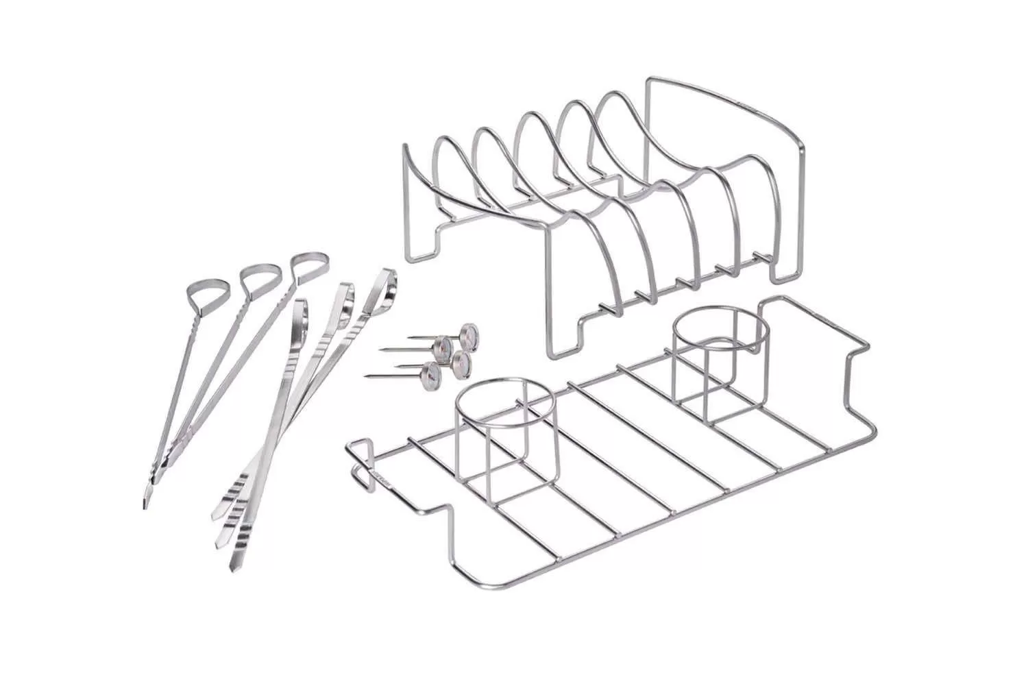 - Includes stainless steel rib rack, double beer can chicken roaster, (6) skewers, and (4) thermometers