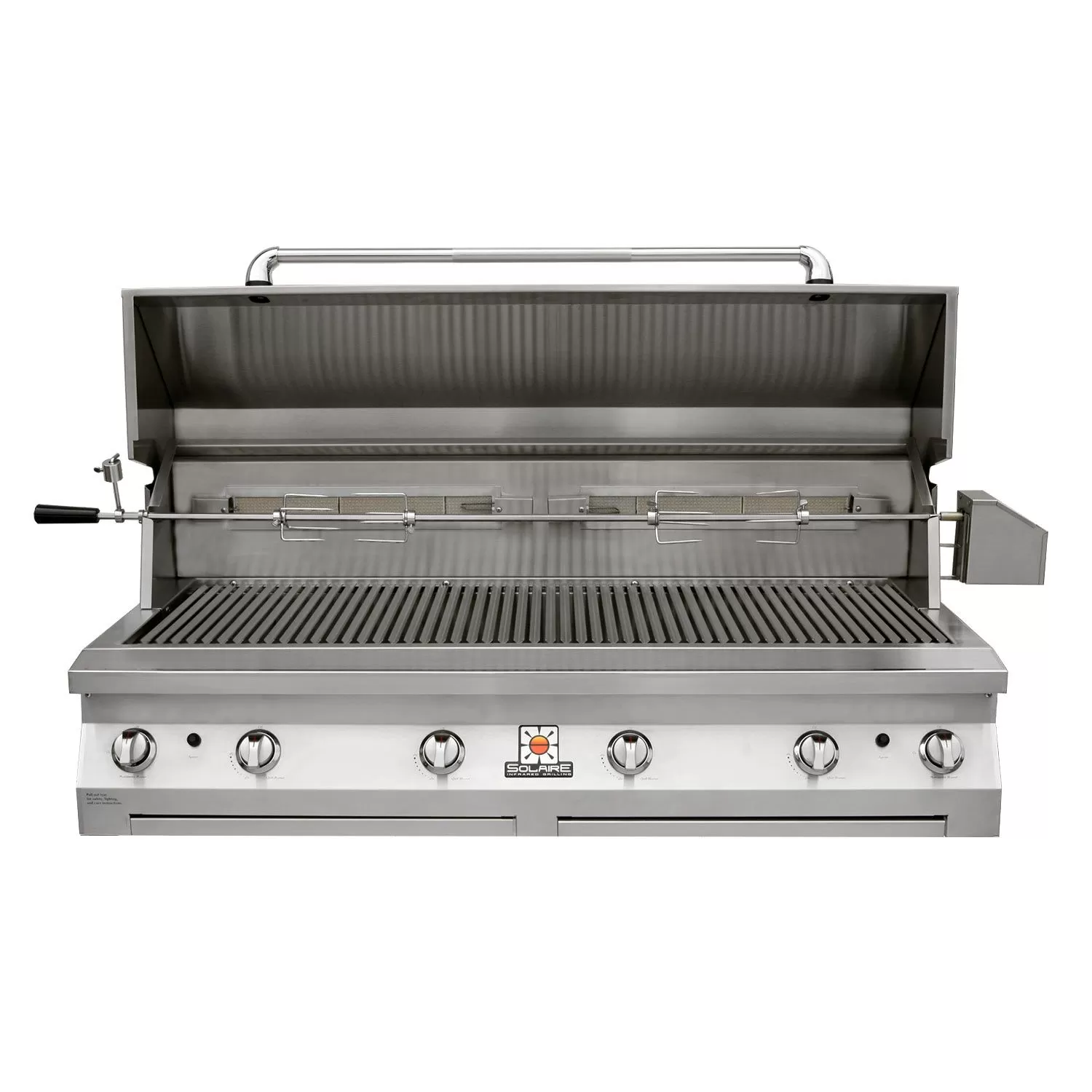 Solaire AGBQ-56 56-Inch Built-In All Grill with Dual Rotisserie provides a professional quality infrared grill designed to offer an improved backyard grilling experience. Featuring four main infrared burners capable of up to 110,000 BTU, this grill offers impressive heating ability across 899 square inches of main grilling area and a total grilling area of 1,293 square inches. Select from all infrared, all convection, and InfraVection burner configurations to match your grilling needs. The Solaire 56-inch All Grill model also includes two independently controlled 14,000 BTU rear infrared rotisserie burners with motors, spit rods, forks, and counterweights to expand the cooking options available on this grill. Your grilling experience can be further enhanced with Solaire’s large assortment of grilling accessories engineered to help you grill to your full potential (sold separately). As an added bonus, this grill features a limited lifetime warranty on all stainless steel construction, main burners, and V-grilling grids as well as a two-year warranty on its ignition system and a one-year warranty on nearly all other parts.