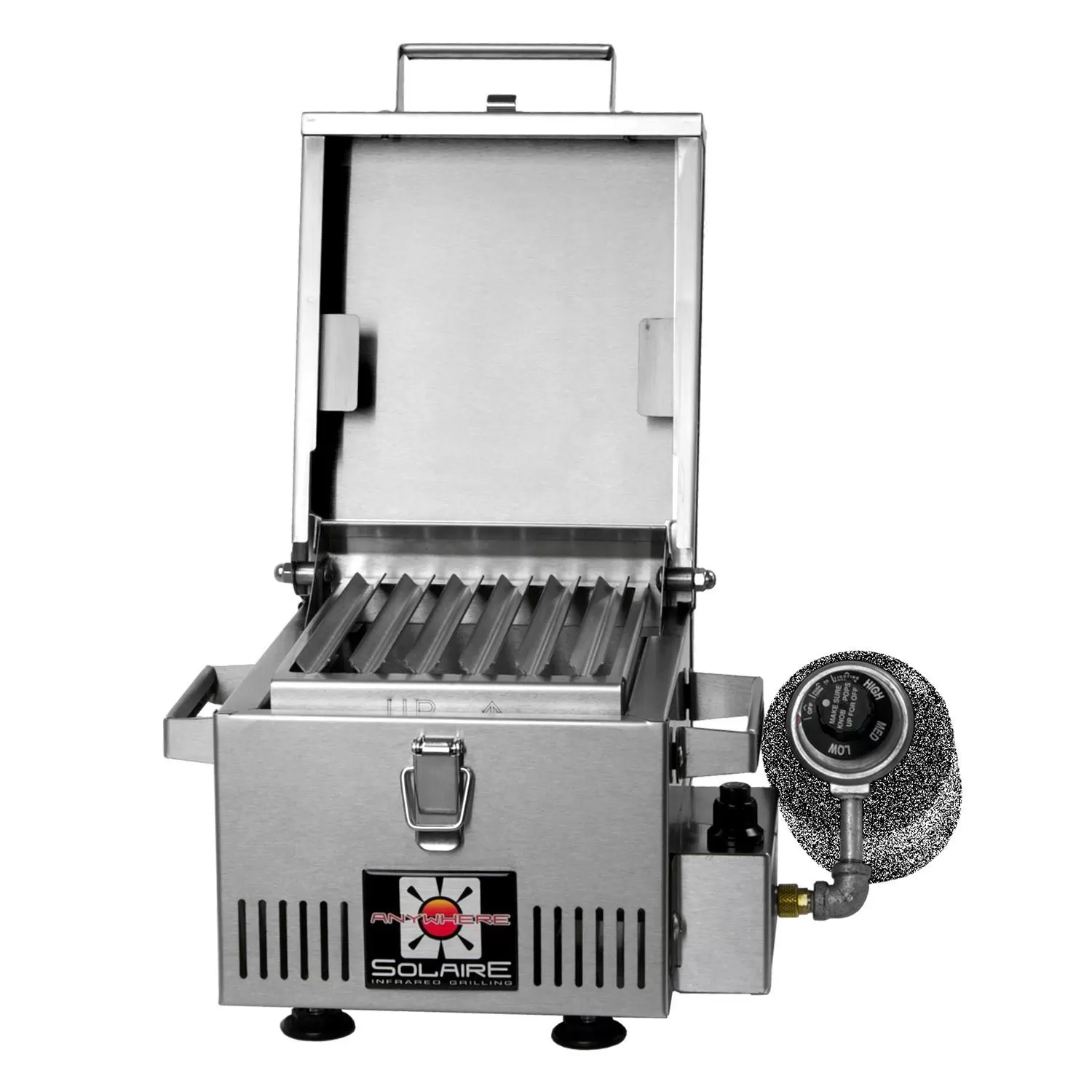 Solaire IR8A Anywhere Mini Personal Infrared Grill provides a professional quality infrared grill designed to offer an improved backyard grilling experience. This single burner grill offers a full grilling experience in a small package. Featuring heavy duty stainless steel construction, this portable grill features the same quality design as larger models to ensure superior durability. The 9,000 BTU burner offers impressive heat across the six-inch by eight-inch grilling surface–great for those with limited space but who still want a high performance grill. This unit is also great for sous vide, searing or other cooking methods along a full-size grill. This ultraportable grill weighs less than nine pounds, allowing for easy transport to picnics, tailgate parties or anywhere else you need to go.