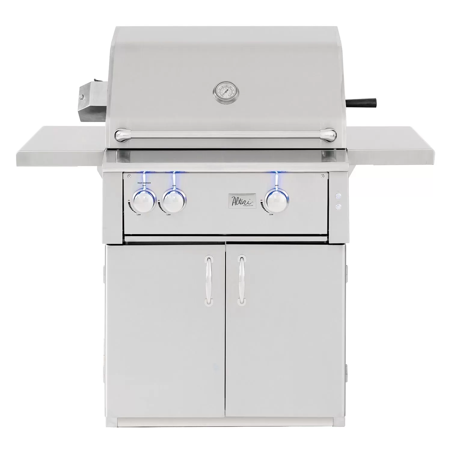 Summerset ALT30 Alturi Series Gas Grill On Cart, 30-Inch combines superior quality and high end performance to provide a terrific option to complete your outdoor kitchen. The grill features a solid 304 stainless steel construction to ensure durability and longevity while each of the (2) heavy duty stainless steel U-Tube burners, rated at 20,000 BTU, provide ultra high heat to the unique captured briquette trays. The captured briquette trays provide even radiant heat across the 780in² cooking surface and eliminate hot and cold zones as the 9mm thick stainless steel grates offer a thick gauge grilling surface for professional style grill marks.