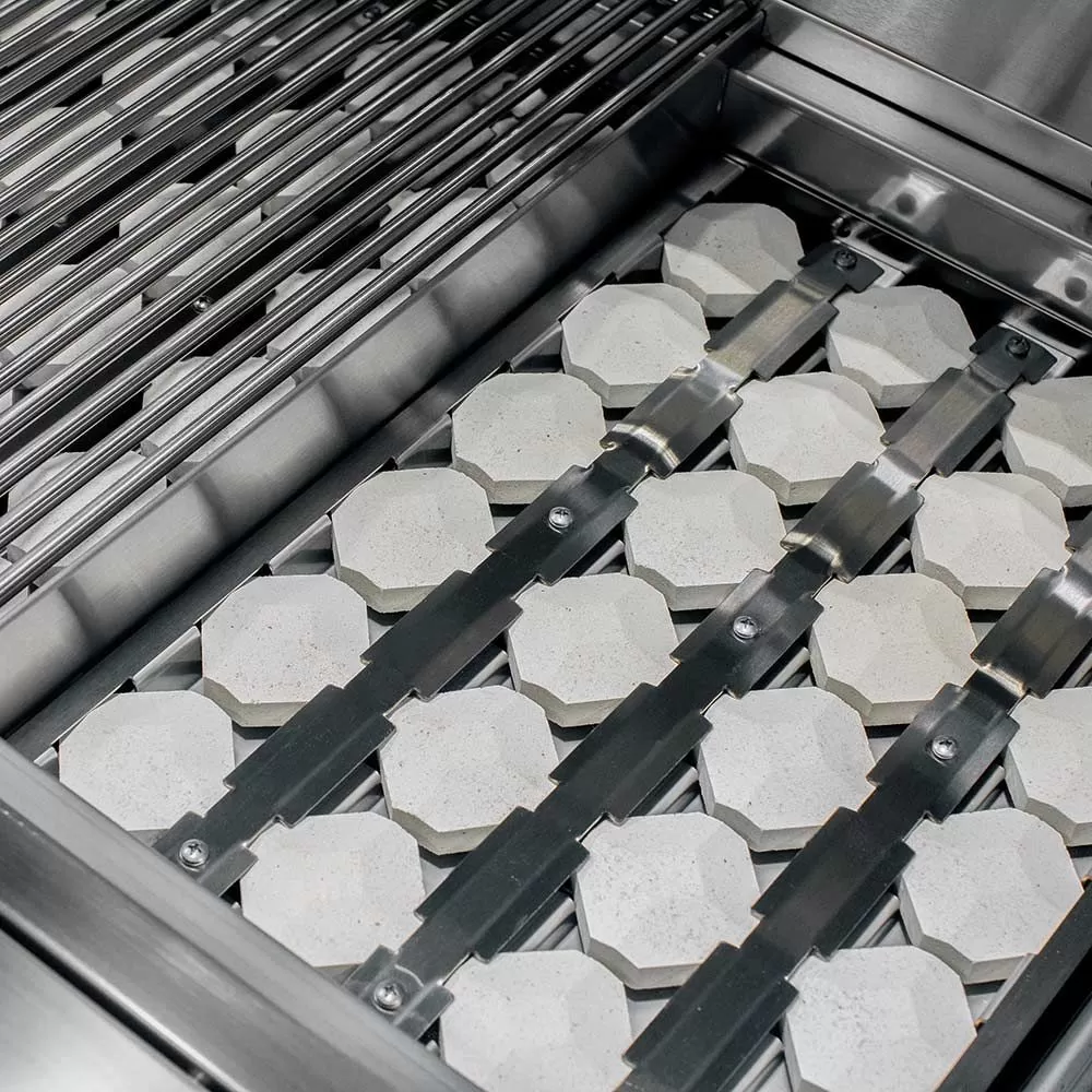 - Captured Briquette Trays – Unique ceramic briquettes sit above the burner to provide radiant heat and eliminate hot/cold zones across the 855in² cooking surface