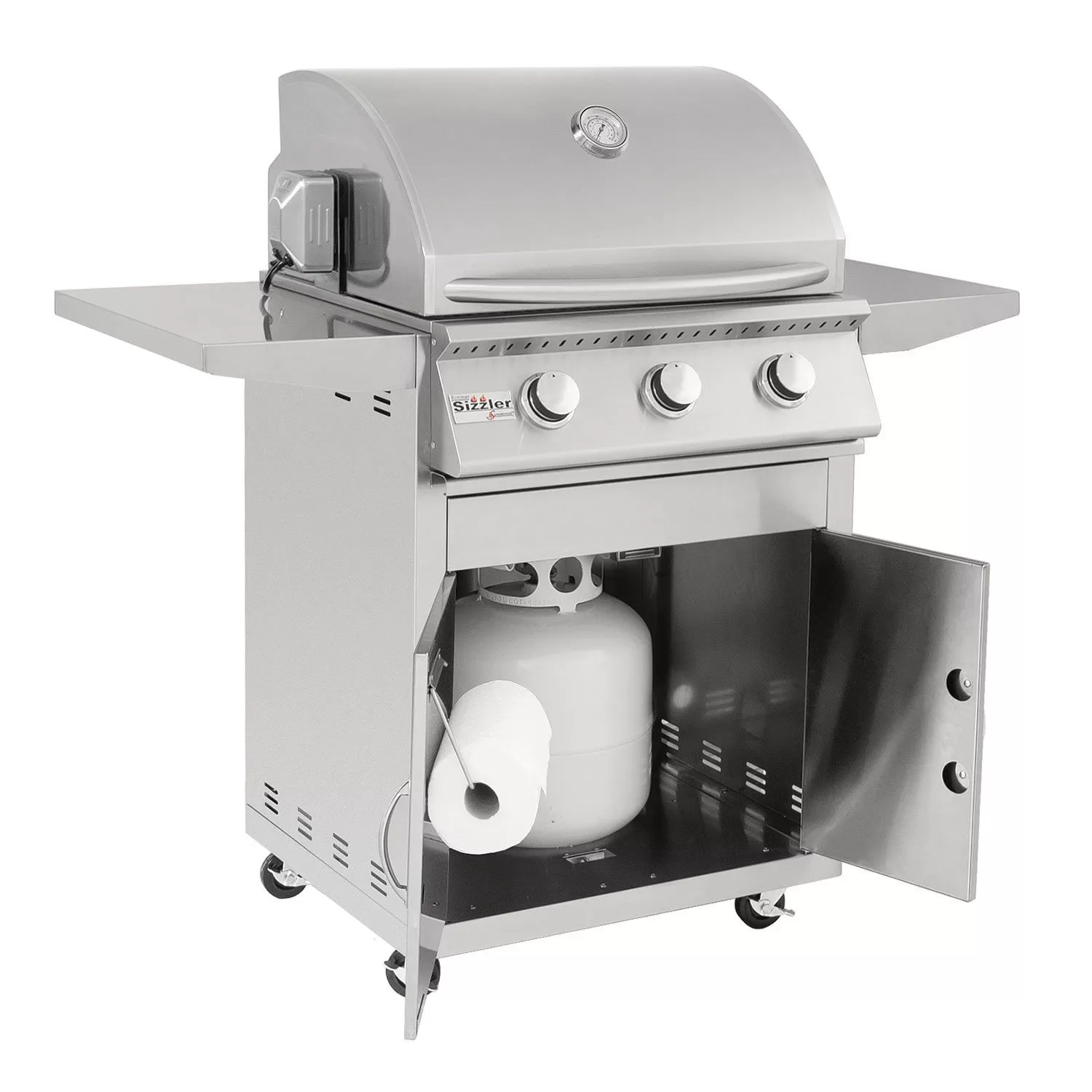 The 26-inch Sizzler also features a unique Flame Thrower Ignition that shoots a burst of flame to ignite the main burners and is much more reliable than traditional spark ignition systems. The insulated and double lined hood keeps hot air in to ensure a consistent grilling environment complete with a built in 3-inch temperature gauge to accurately monitor your grilling temperature. The stainless steel grill cart features double door storage, fixed shelves, and high quality locking casters to provide a terrific stand alone grill option.