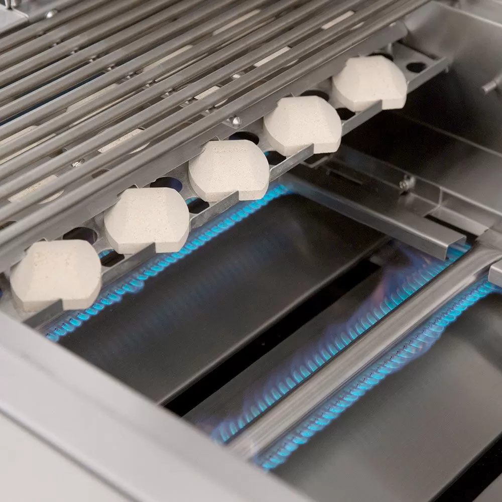 - Captured Briquette Trays – Unique ceramic briquettes sit above the burner to provide radiant heat and eliminate hot/cold zones across the 560in² cooking surface