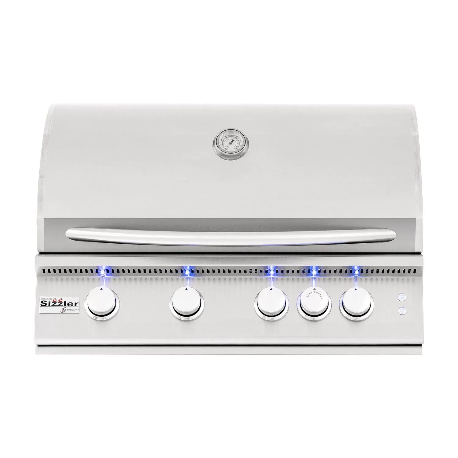 The 32-inch Sizzler also features a unique Flame Thrower Ignition that shoots a burst of flame to ignite the main burners and is much more reliable than traditional spark ignition systems. The insulated and double lined hood keeps hot air in to ensure a consistent grilling environment complete with heat zone dividers, built in 3-inch temperature gauge, (2) interior lights, and enhancing LED lights. In addition, the 15,000 BTU infrared back burner offers a high quality rotisserie burner for professional style rotisserie cooking. Available for both propane and natural gas, this built-in grill is the perfect choice to complete your outdoor kitchen.