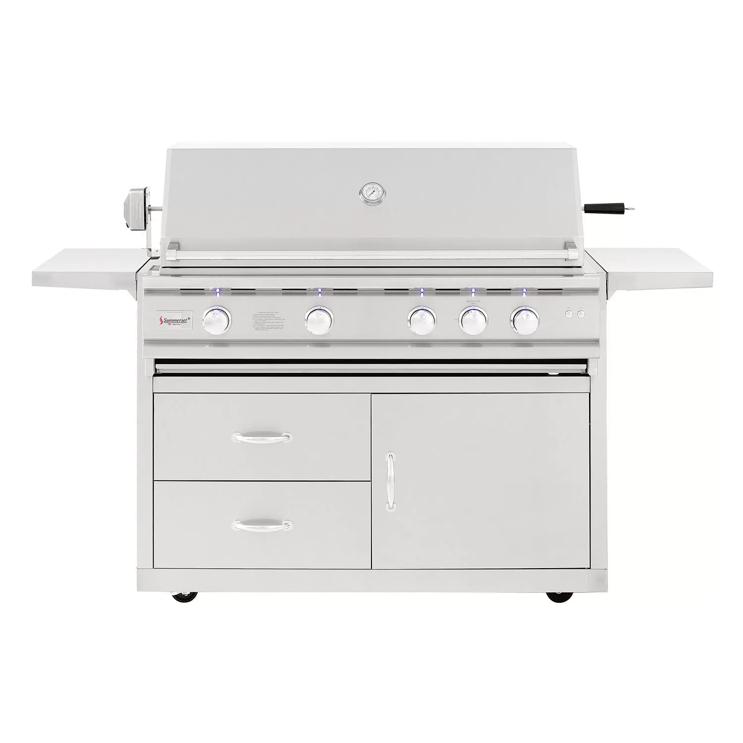 Summerset TRLD44 TRL Deluxe Series Gas Grill On Cart, 44-Inch combines superior quality and high performance to provide a terrific option to complete your outdoor kitchen. The grill features a solid 304 stainless steel construction to ensure durability and longevity while each of the (4) heavy duty cast stainless steel burners are rated for 20,000 BTU to provide high heat to the unique captured briquette trays. The captured briquette trays provide even radiant heat across the 864in² cooking surface and eliminate hot and cold zones as the 9mm thick stainless steel grates offer a thick gauge grilling surface for professional style grill marks.