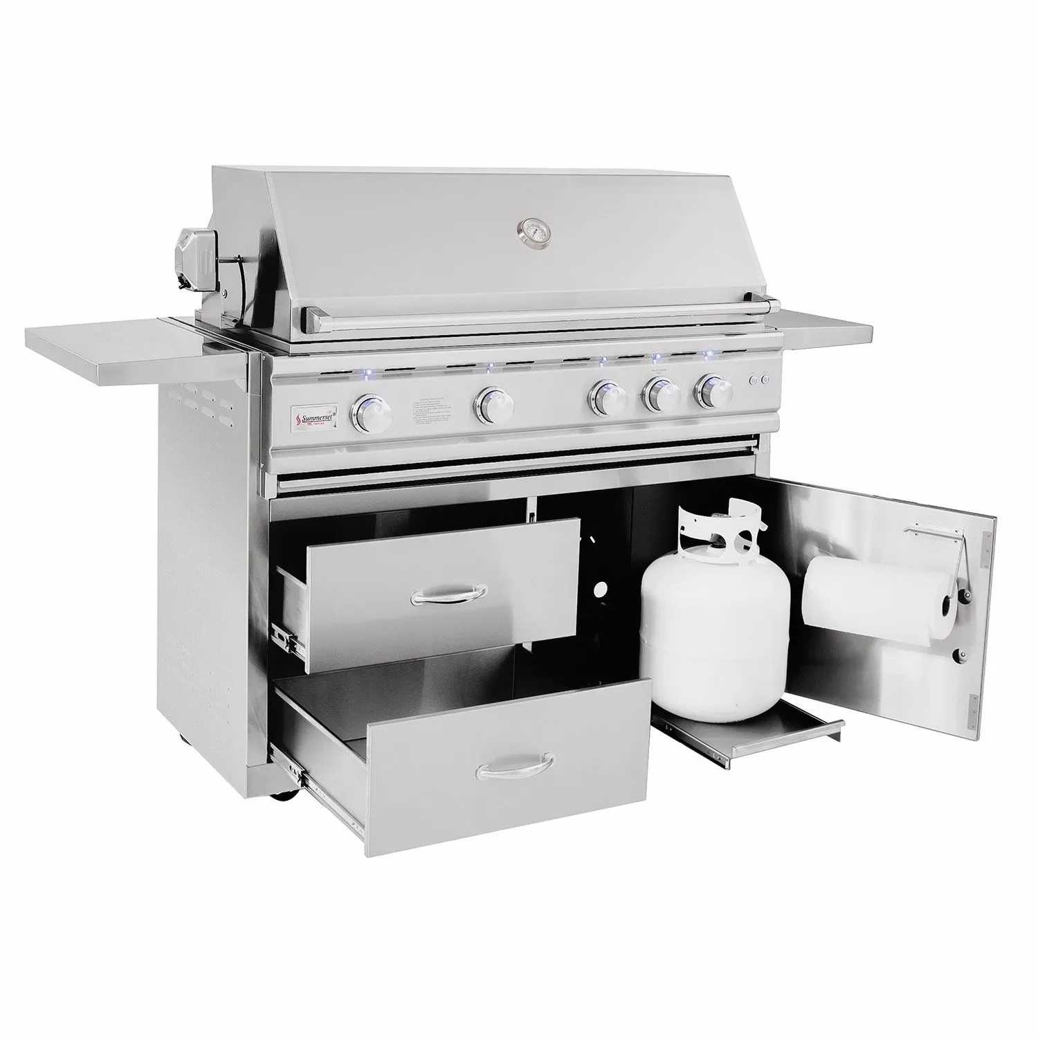 - Freestanding Grill Cart – Stainless steel grill cart features double storage doors with a pull out propane tank tray, foldable side shelves, and locking casters