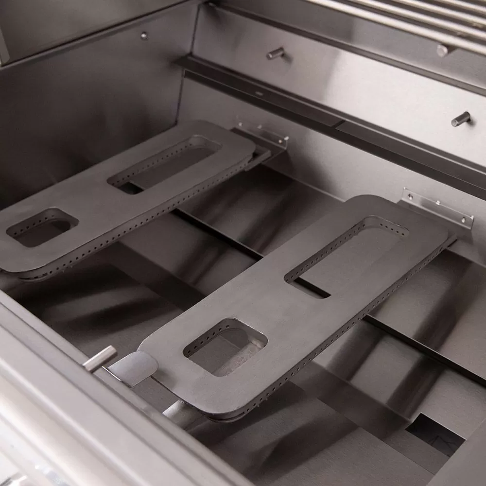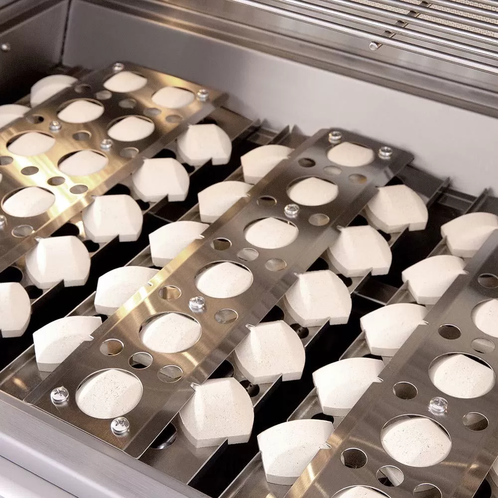 - Captured Briquette Trays – Unique ceramic briquettes sit above the burner to provide radiant heat and eliminate hot/cold zones across the 864in² cooking surface