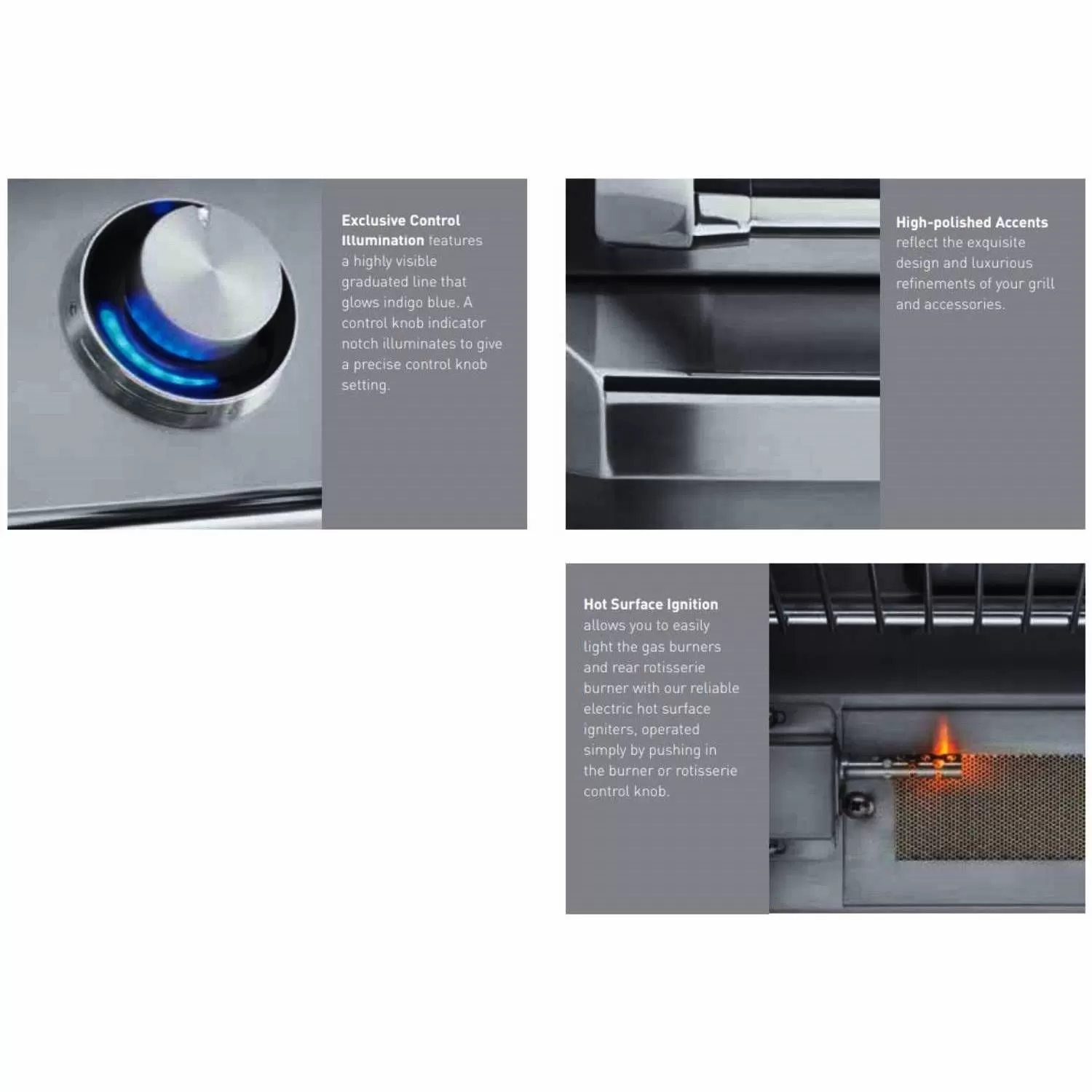- Decorative LED Lights illuminate the control knobs, turning your grill into the main attraction–even when not in use. The exquisite hi-polished accents add luxurious refinements to your grill and accessories.