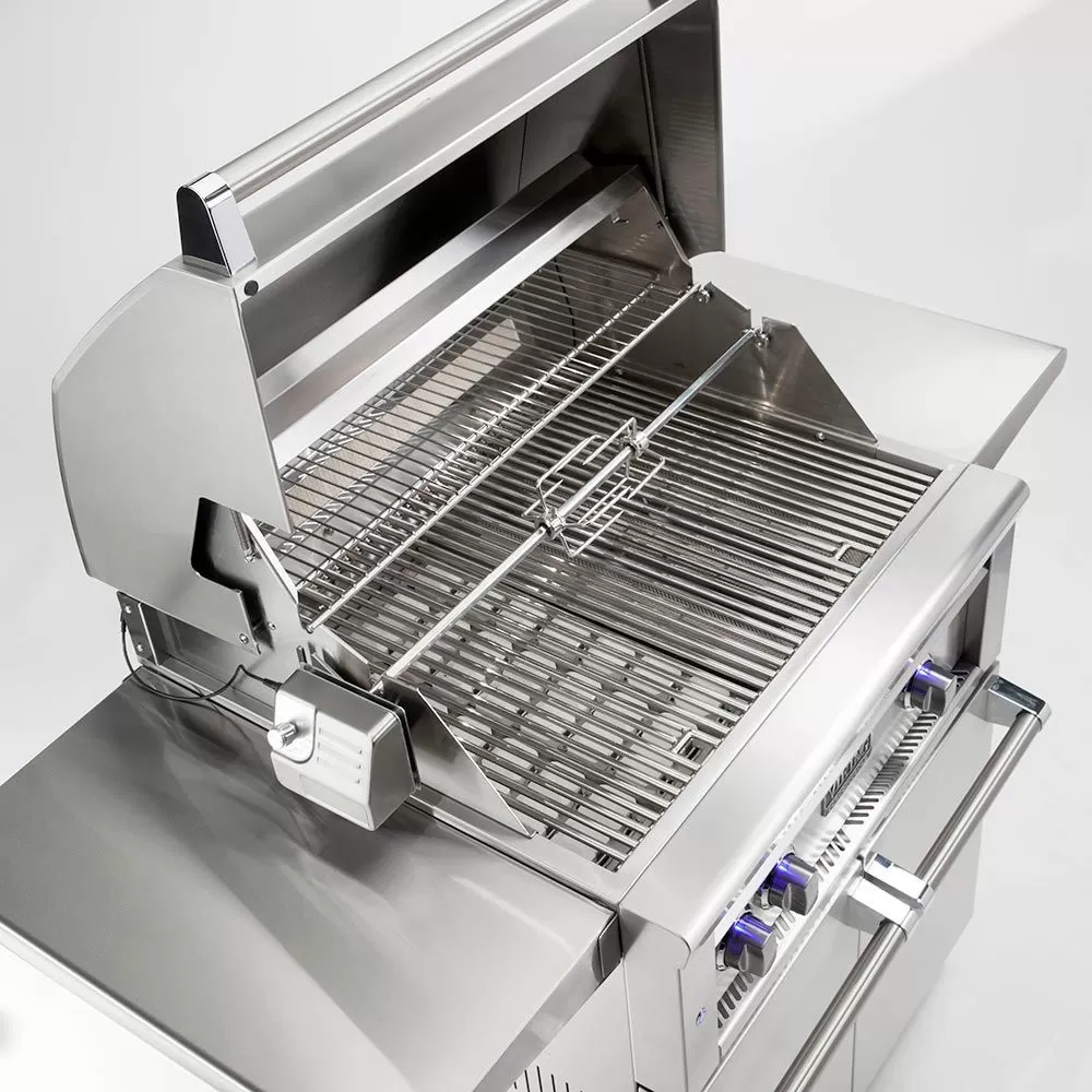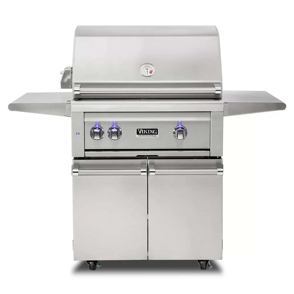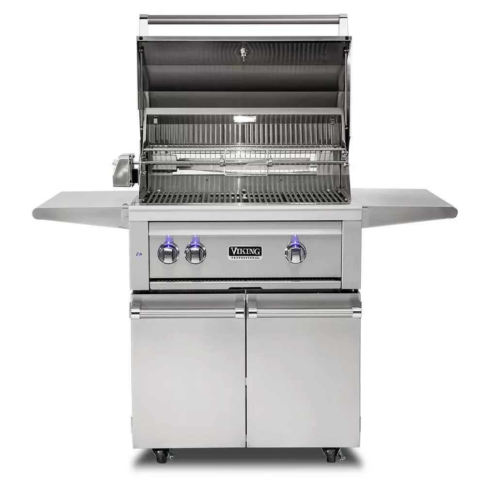 Viking 5 Series Stainless Steel Cart Gas Grill with ProSear Burner & Rotisserie, 30-Inch (VQGFS530) offers a top-of-the-line experience for the grill master who is serious about performance and quality, built from 16-gauge stainless steel to last through the years. It features (1) commercial grade cast brass burner which puts out 25,000 BTU and an infrared ProSear burner for achieving excellent color and flavor every time. As if that weren’t enough, it also comes outfitted with a dedicated infrared rear burner and heavy-duty rotisserie kit with a 3-speed motor for even more versatility. Combine all of this with the high-density ceramic briquettes providing even and reliable radiant heat across the 840in² grilling surface and you’ve got a grill that produces delicious results that are sure to impress.